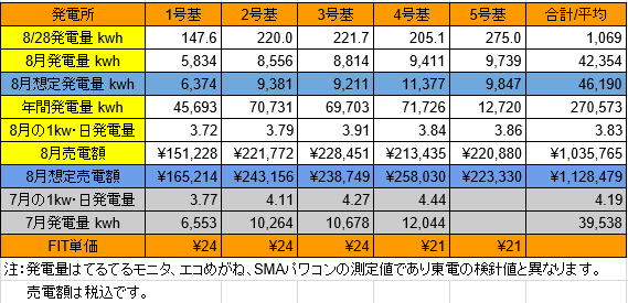 それでは、8/28の発電量です。(各発電所の仕様はこちらです)