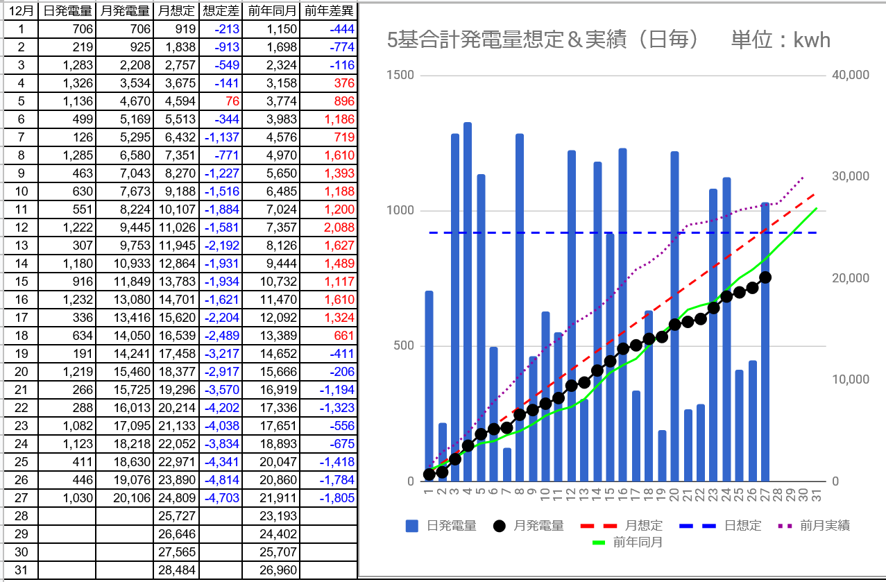 12/26の5基合計の発電量は446kWh(日想定差-472kWh)、12/27は1,030kWh(日想定差+111kWh)でした。パネル1kwあたり1日の発電量は1.89kWhのままでした。
