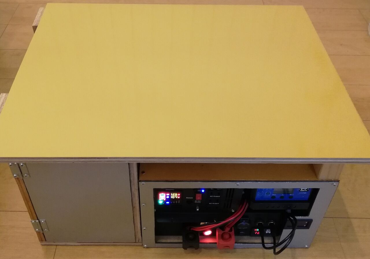 奥行をポータブル電源に合わせましたので、手前のアルミ複合板を開けて空いたスペースにケーブル等を収納できるようにしました。