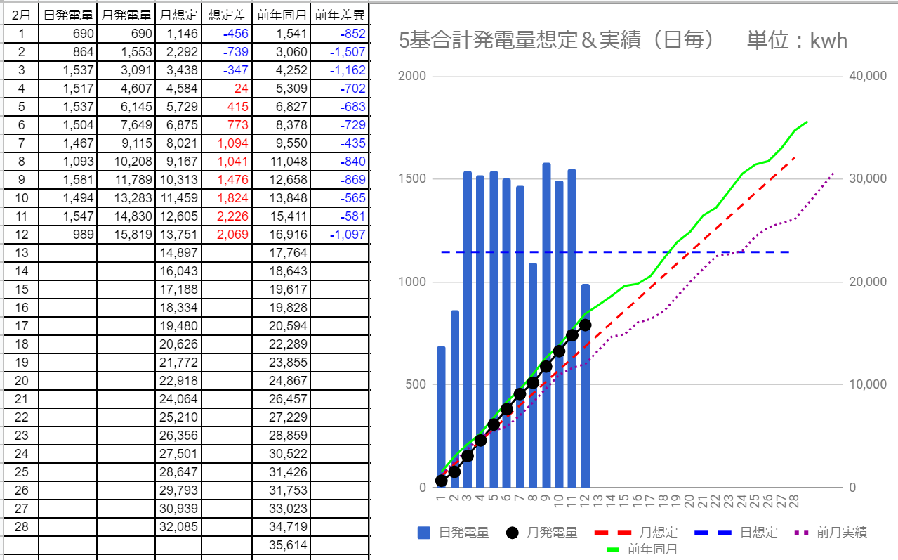 2/11の5基合計の発電量は1,547kWh(日想定差+401kWh)、2/12は989kWh(日想定差-157kWh)でした。