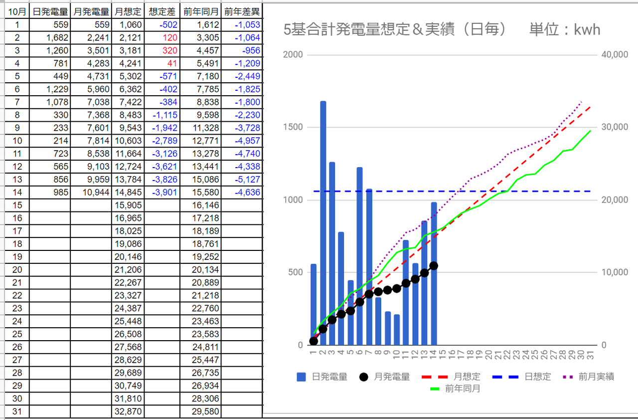 月発電量は15,819kWhで想定差は2/10の+1,824kWhから+2,069kWhに伸長しました。