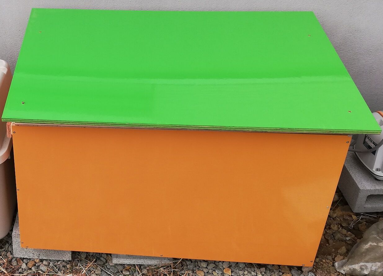 上部に電子レンジを置けるように天板(これもコンパネ)を付けフラットにしました。