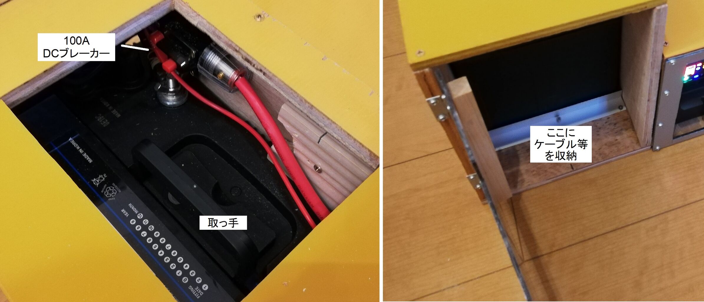 上部真ん中の四角い穴は、移動時にバッテリーの取っ手を持つためとDCブレーカーを操作できるようにするためです。