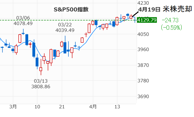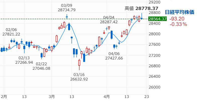 今日4/21の日経平均は一時3/9の高値を超える場面もありましたが終値は93円安で引けました。