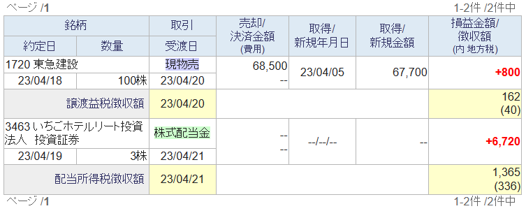 奥さん口座では4/18に東急建設を売却し4/19にいちごホテルリートの配当が入り、
