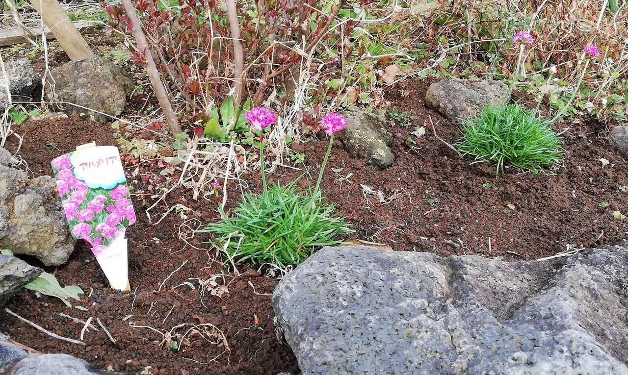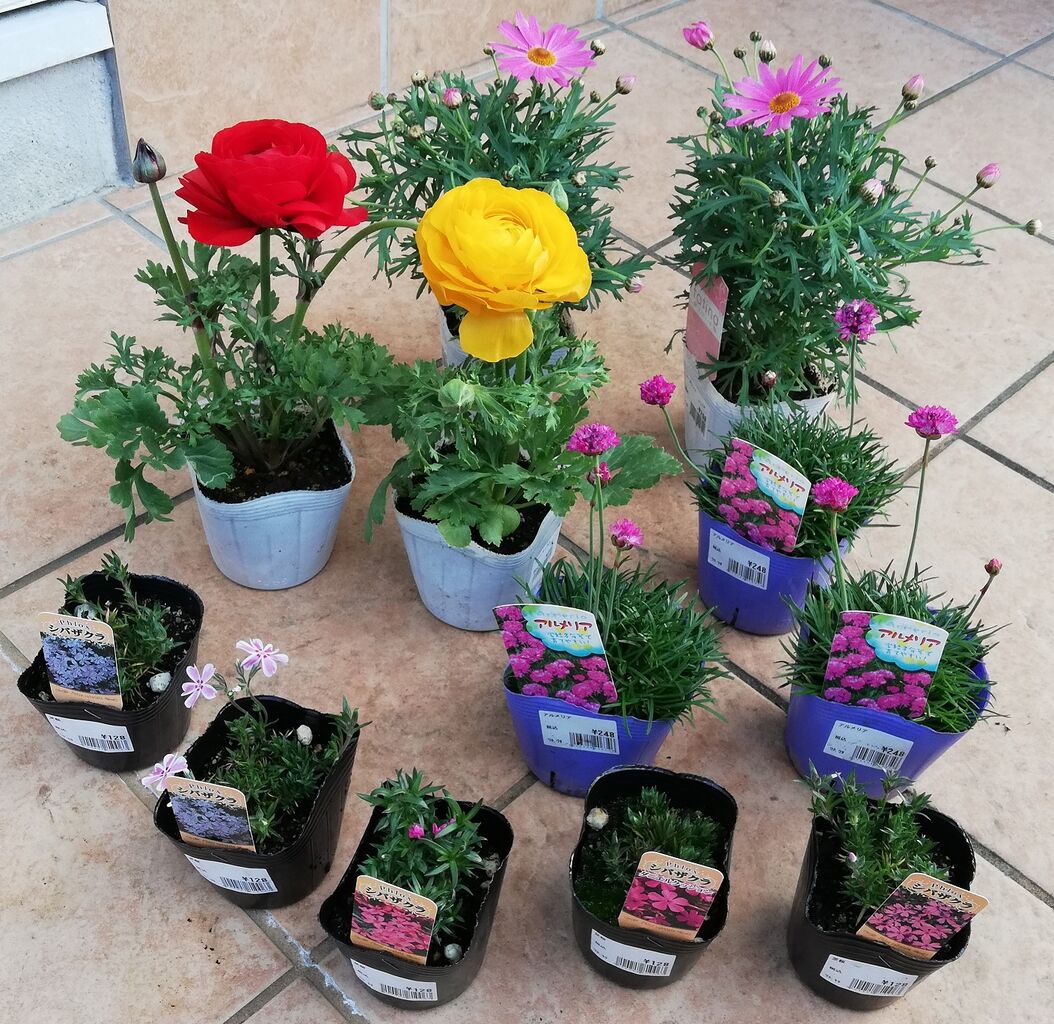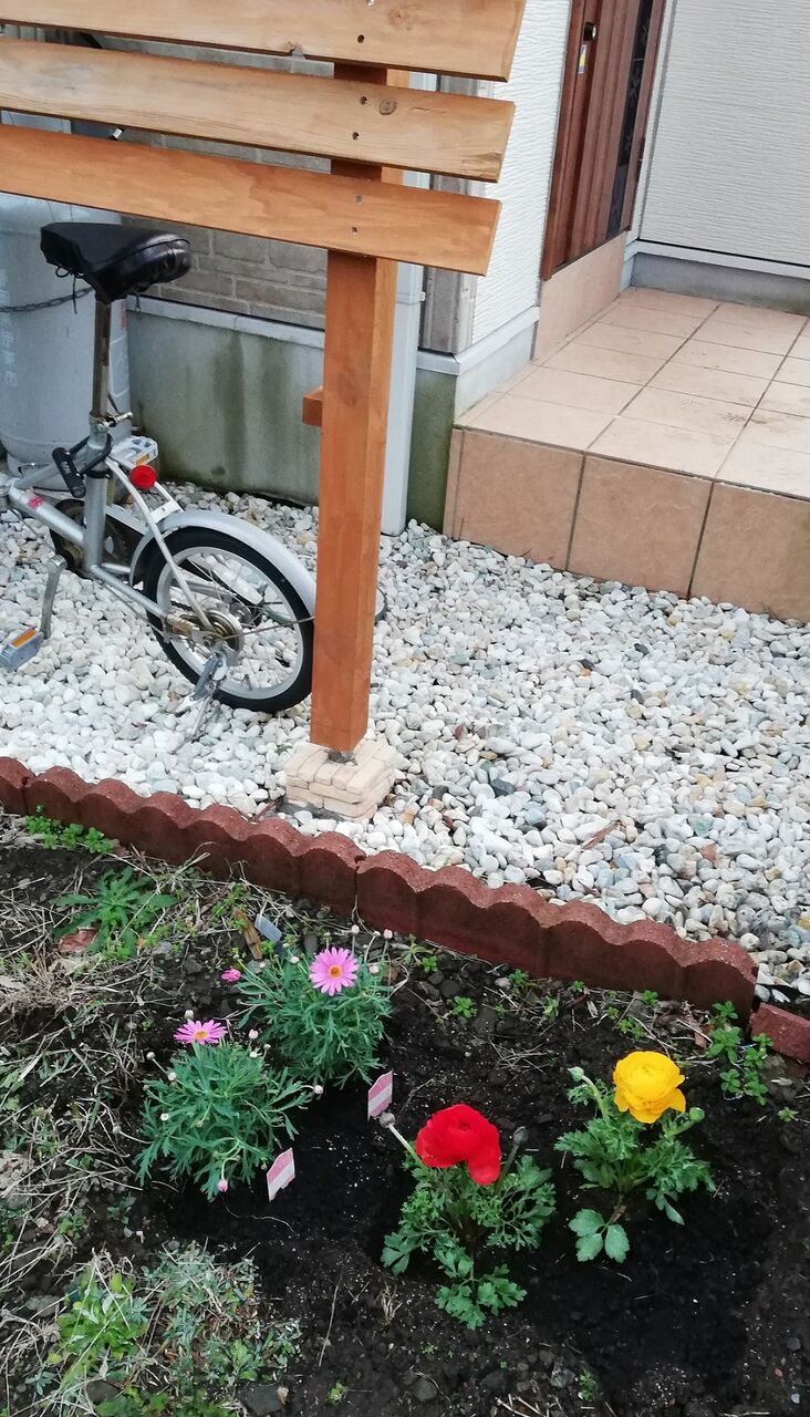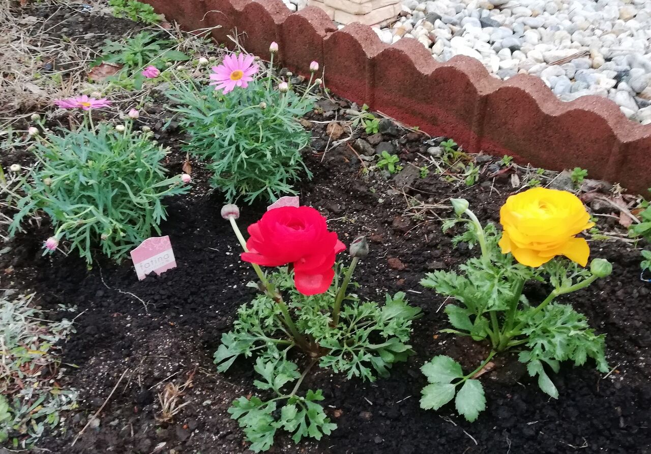鉢植えにして花壇の横に置いたラナンキュラス↓は、