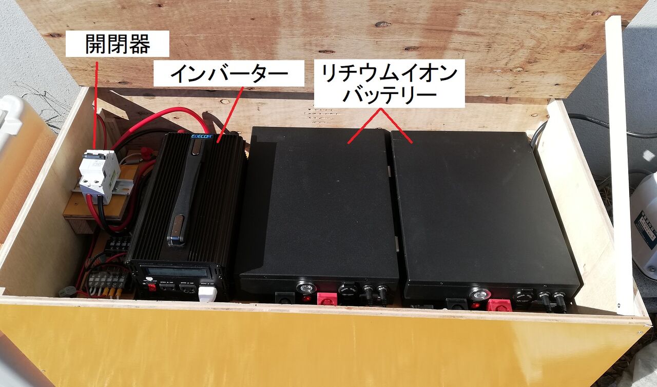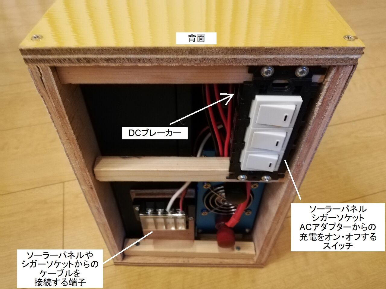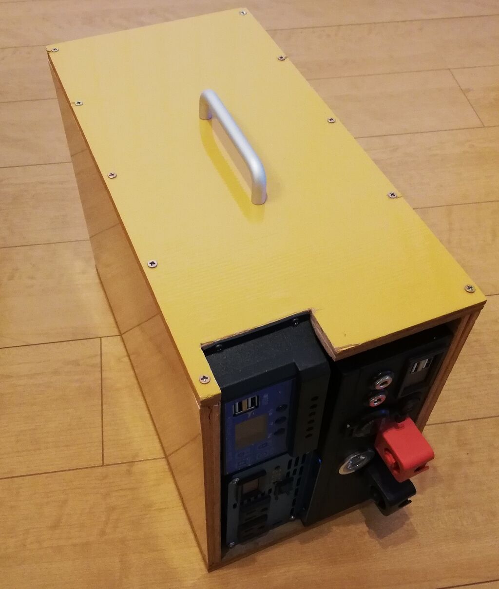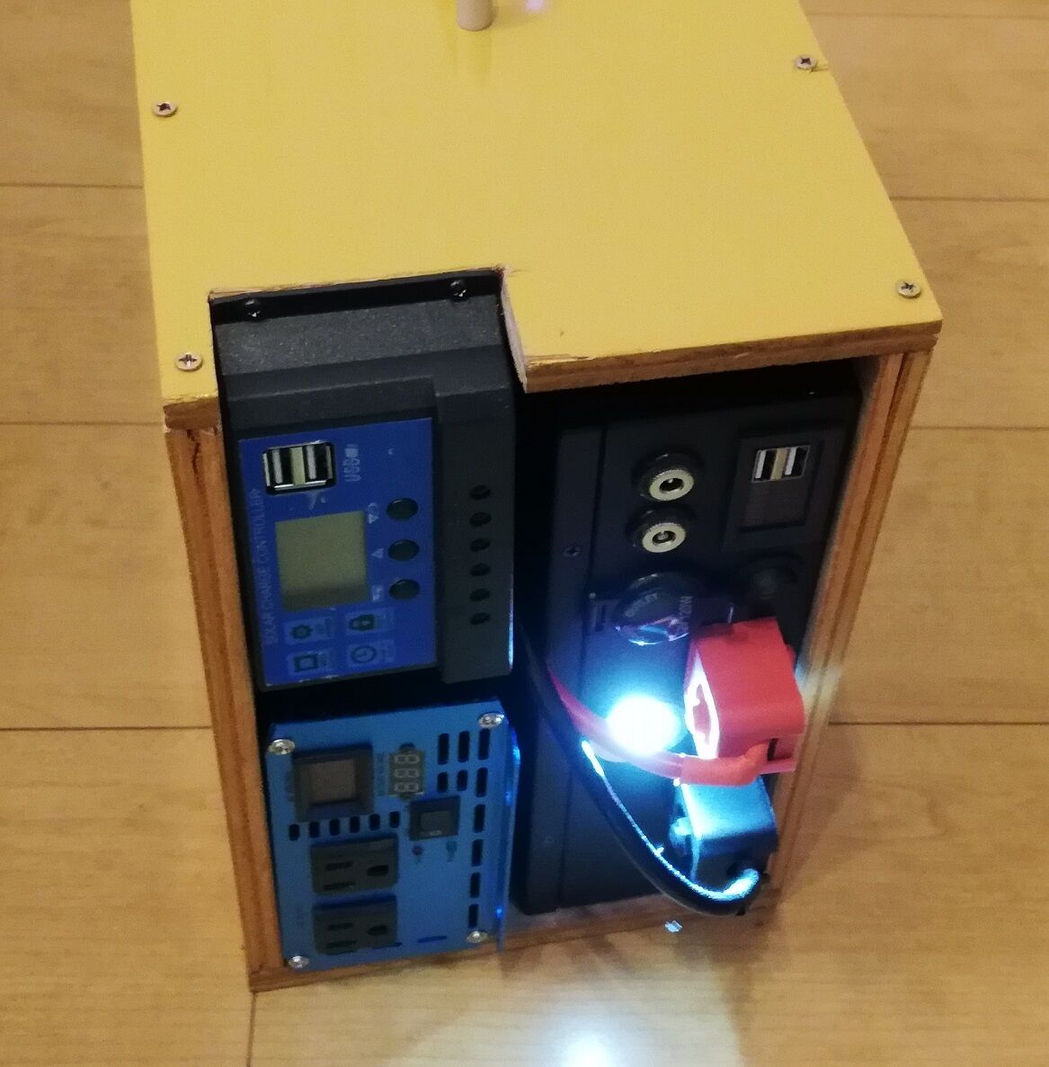 その木枠に更に別のブラケットと木材でポータブル電源を固定しました。