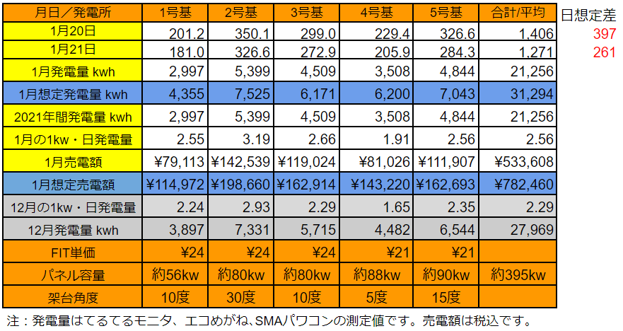 それでは、2/19~2/20の発電量です。(各発電所の仕様はこちらです)