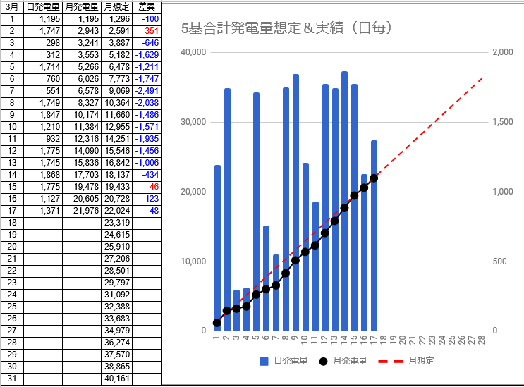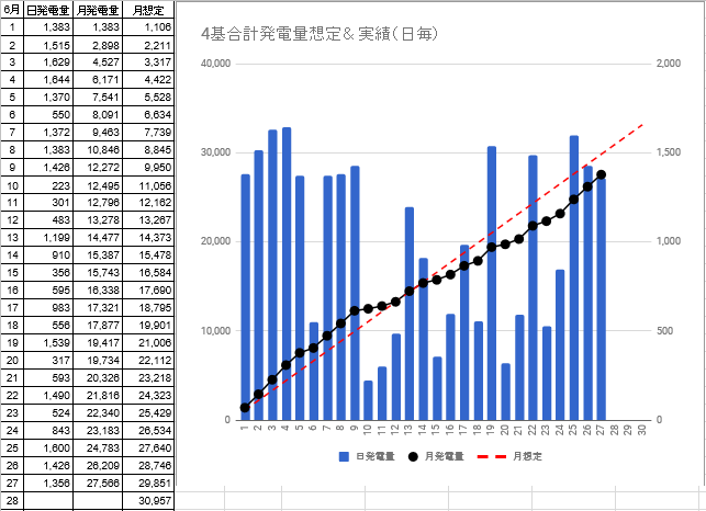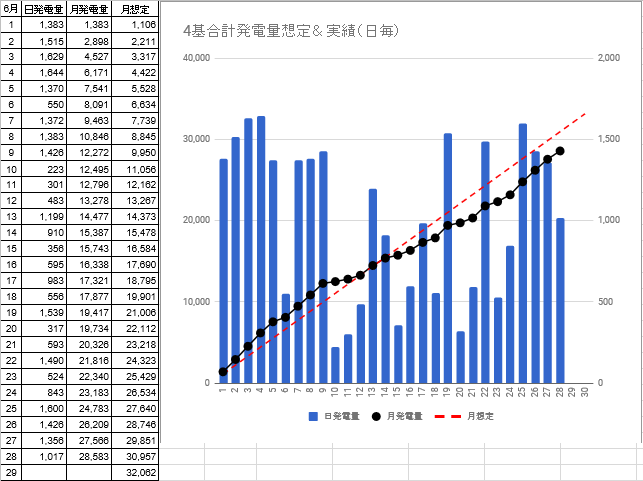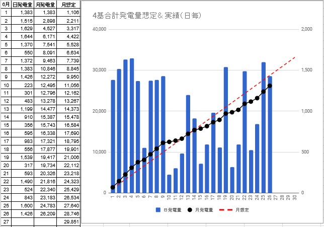 月間発電量は23,145kwhで月想定との差異は-8,285kwhから-9,734kwhに拡大しました。う~ん、カイリが1万kwhを超えそうです!(^_^;) 早く梅雨明けして挽回して欲しいものです。