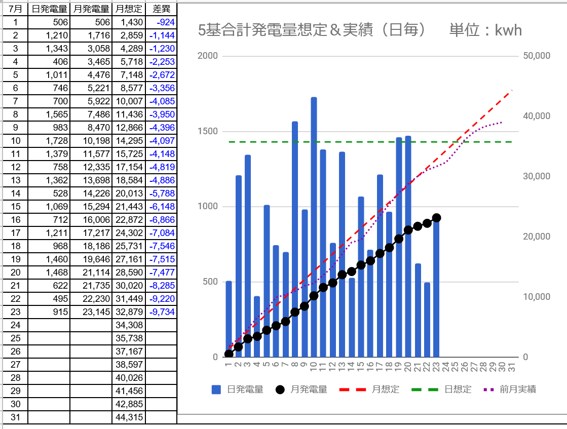 7/22の5基合計の発電量は495kwh(日想定差-935kwh)、7/23は915kwh(日想定差ー515kwh)でした。1kw・日当たりの発電量は2.62から2.55kwhにダウンしました。
