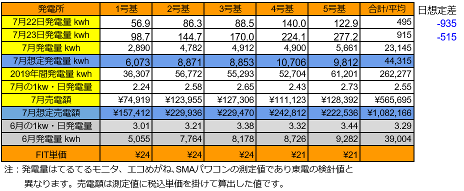 それでは、7/22と23の発電量です。(各発電所の仕様はこちらです)