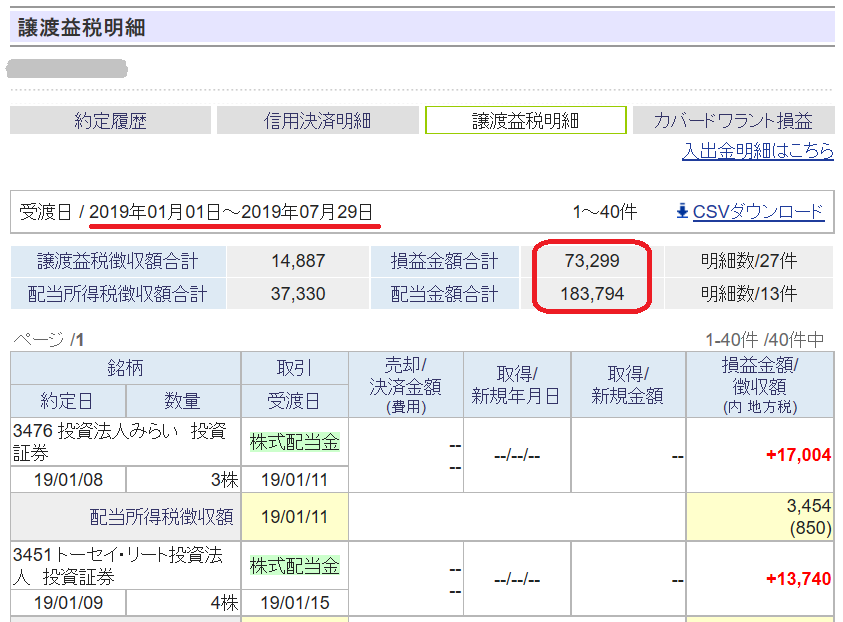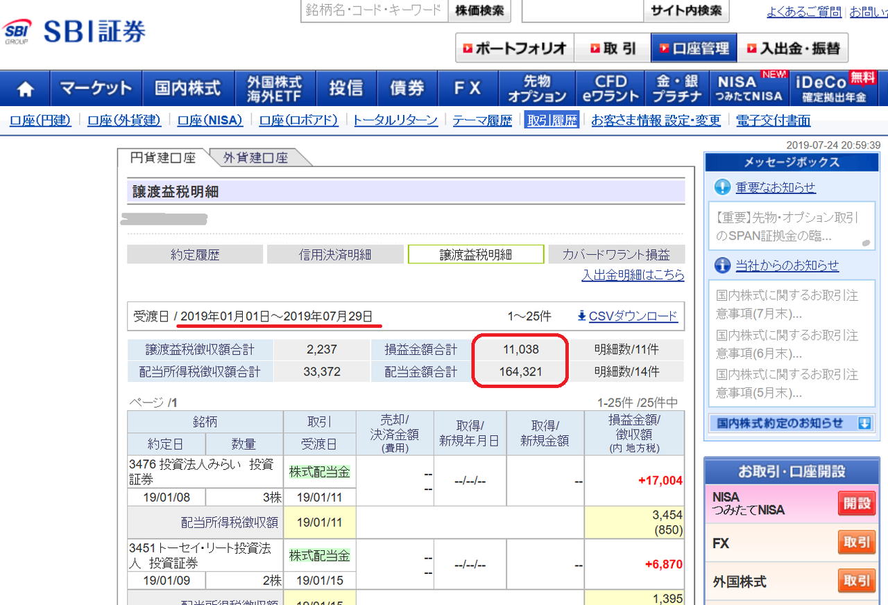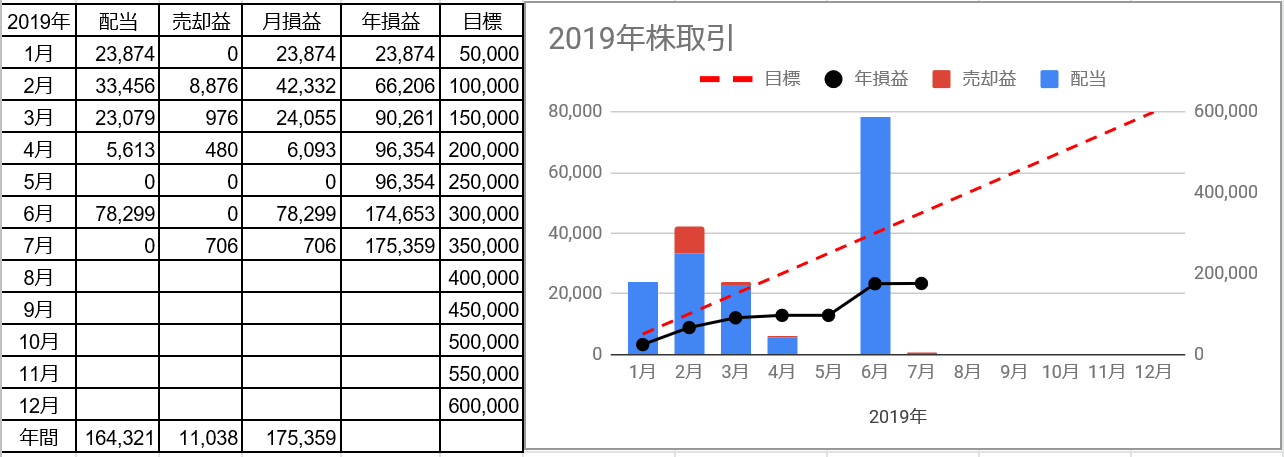 今年(2019年)の株取引は7/24迄で損益が約17.5万円(配当含む)と、いまいちですが、株取引を控えていますので、やむを得ないですね。
