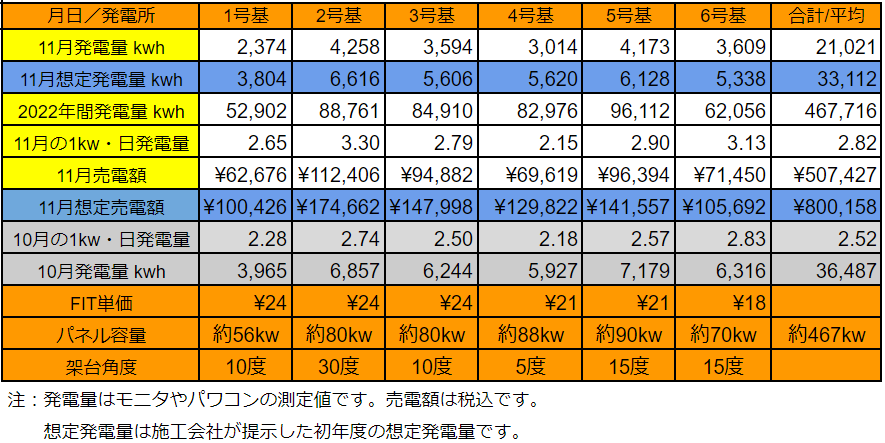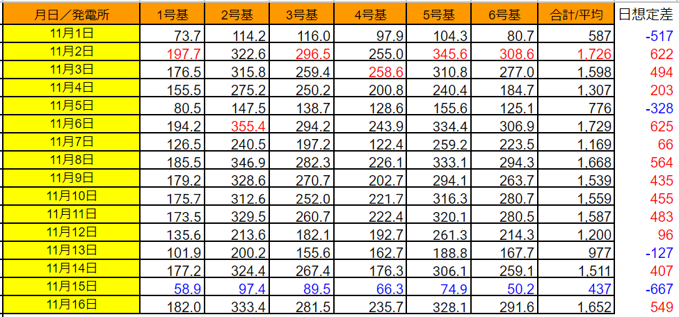 では、11/16迄の発電量をチェックします。(各発電所の仕様はこちらです)。