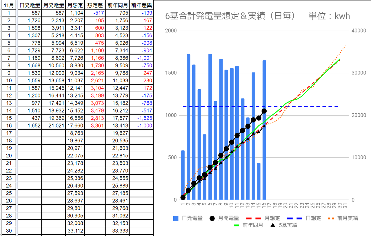 それでも昨年比は-1,000kWhです。昨年の11月前半はかなり良かったようです。