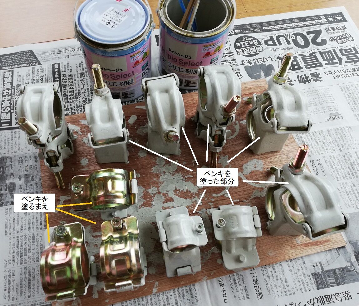そのため単管パイプ2本とそれを取り付けるクランプにペンキを塗ります。