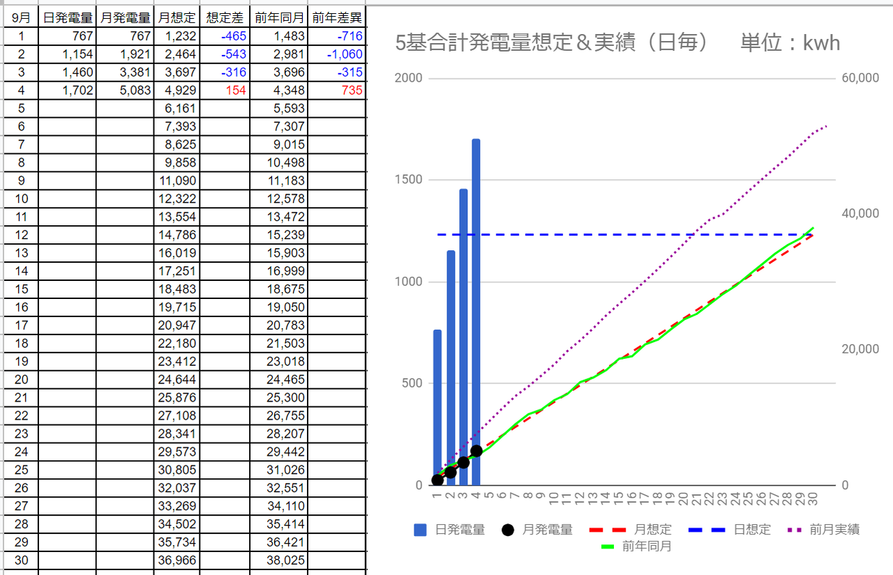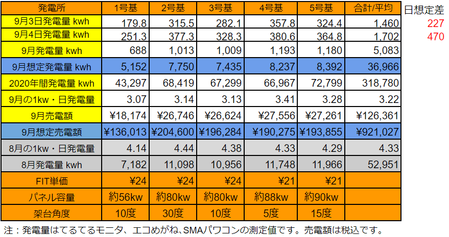 9/3の5基合計の発電量は1,460kWh(日想定差+227kWh)、9/4は1,702kWh(日想定差+470kWh)でした。