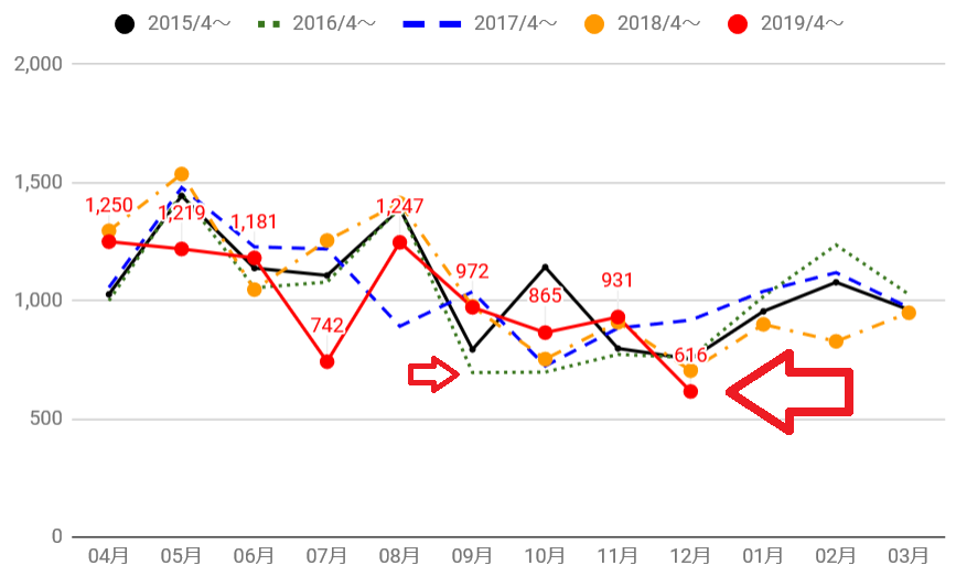 昨年12月との差異もマイナス4桁になりました。(^_^;)