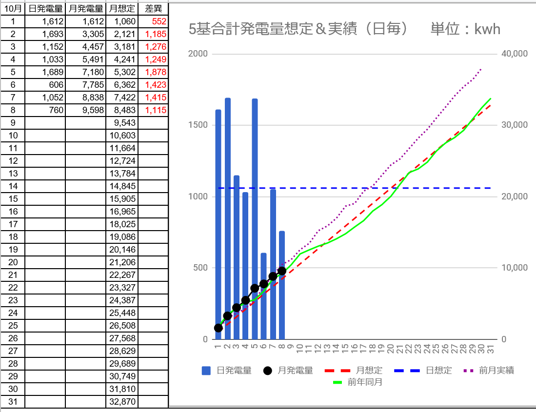これまで最低だった2016年9月の696kWhを80kWH(-11.5%)下回っています。