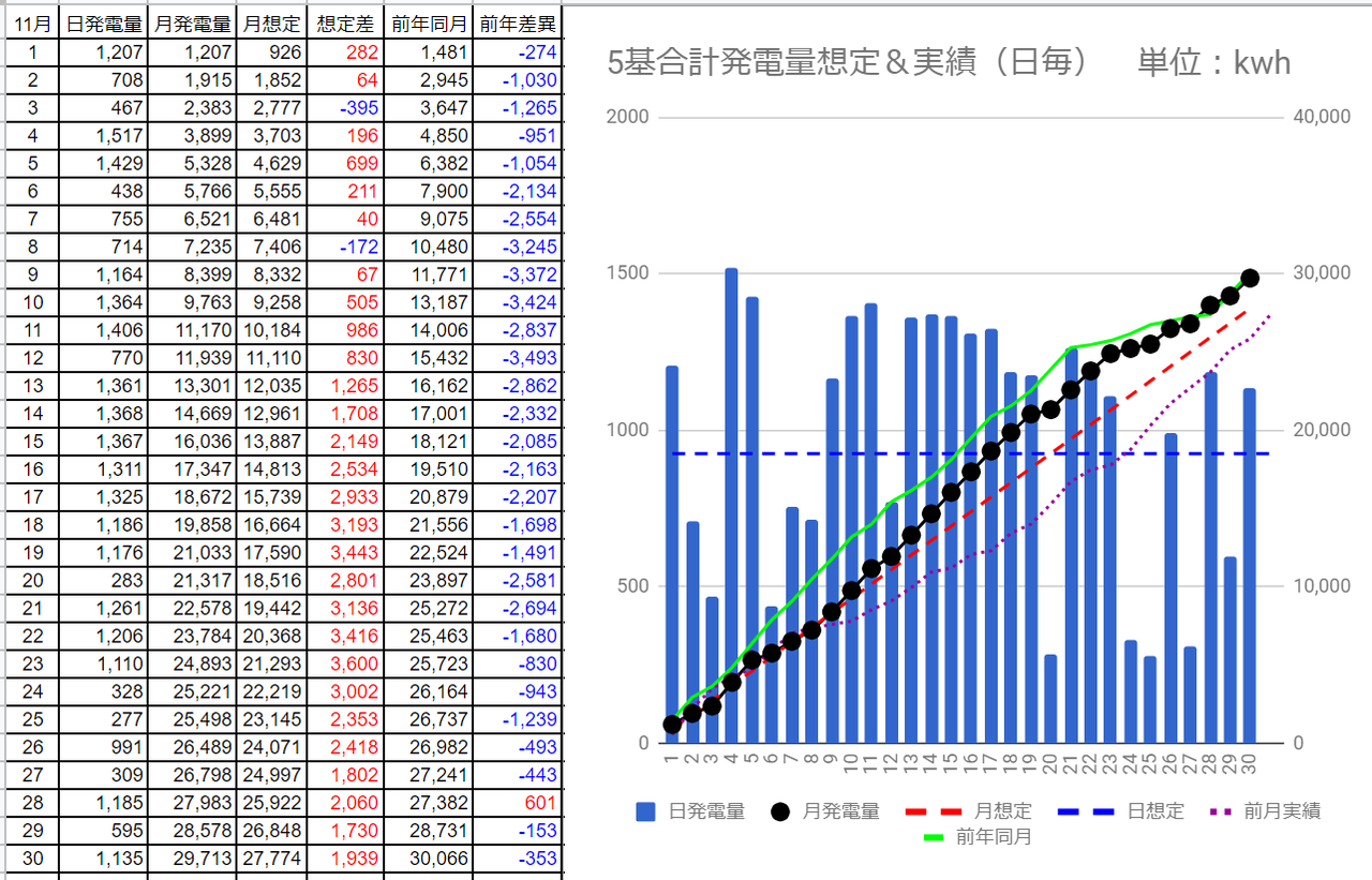11月はまずまずの天候が続き11/28時点では想定発電量を超えていましたが、月間発電量はどうだったでしょうか?