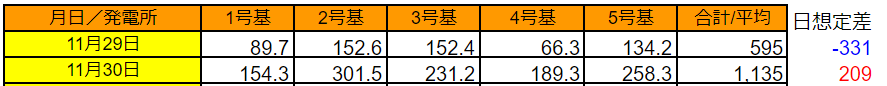 まずは、11/29~30の発電量から確認します。(各発電所の仕様はこちらです)