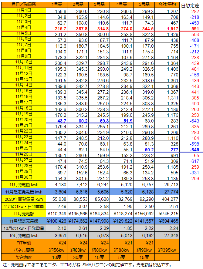 日別にみると、今月、発電量が最も大きかったのは11/4の1,517kWh(想定差+591kWh)で、最小は11/25の277kWh(想定差-649kWh)でした。