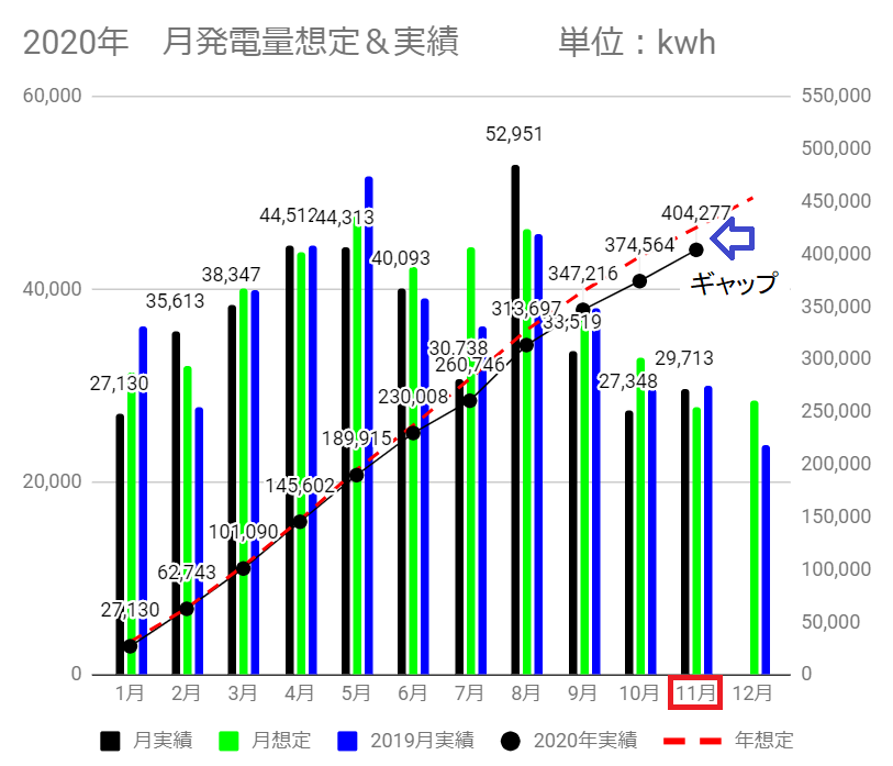 11月までの年実績は404,277kWhで、2019年の418,864kWhと比べると96.5%の水準です。
