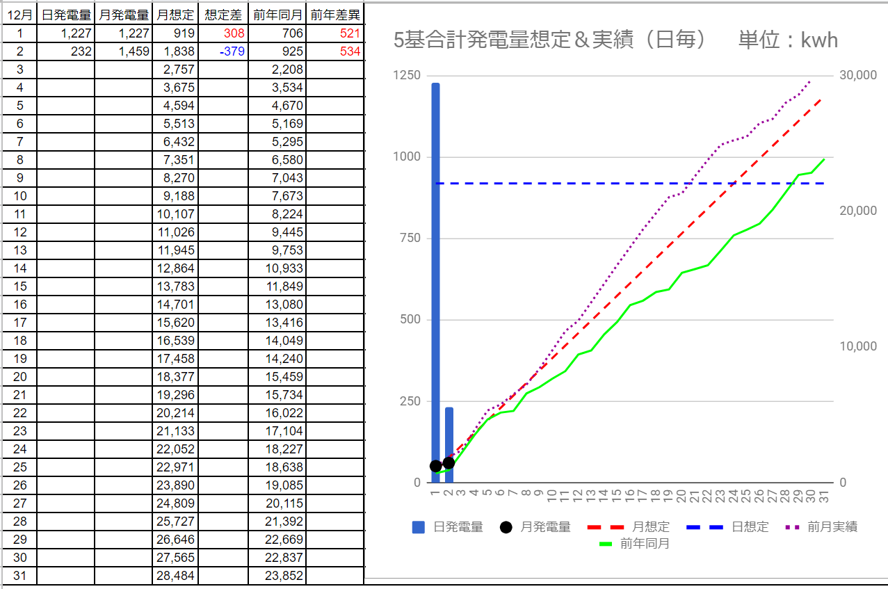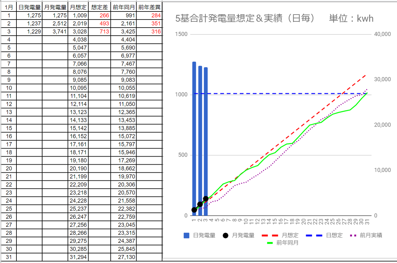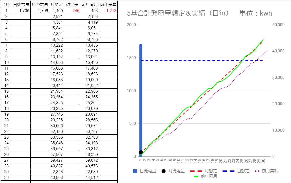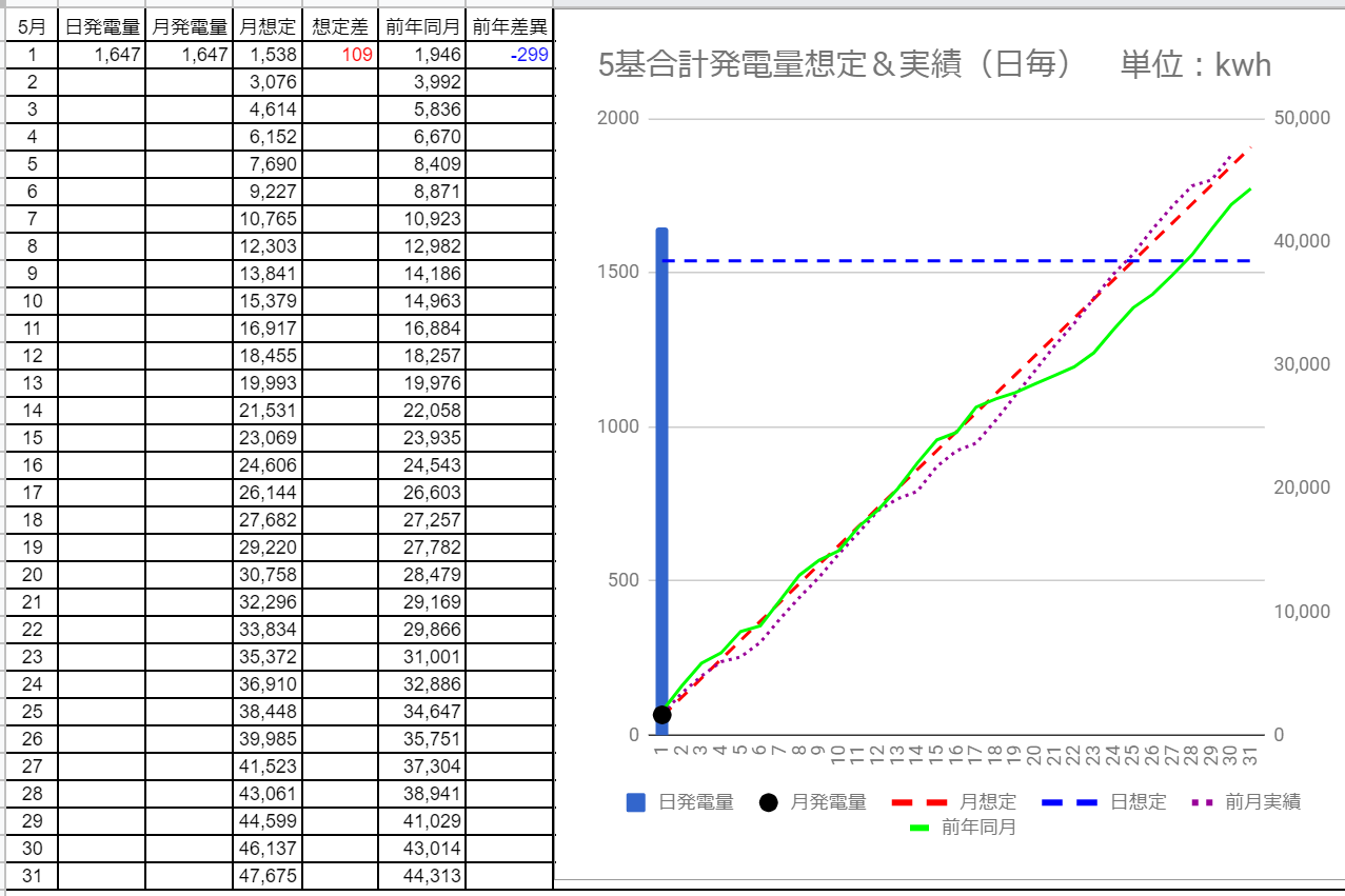 5基合計の発電量は1,647kWhで想定差は+109kWhでした。