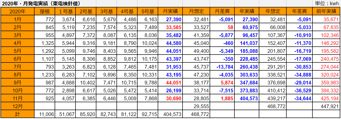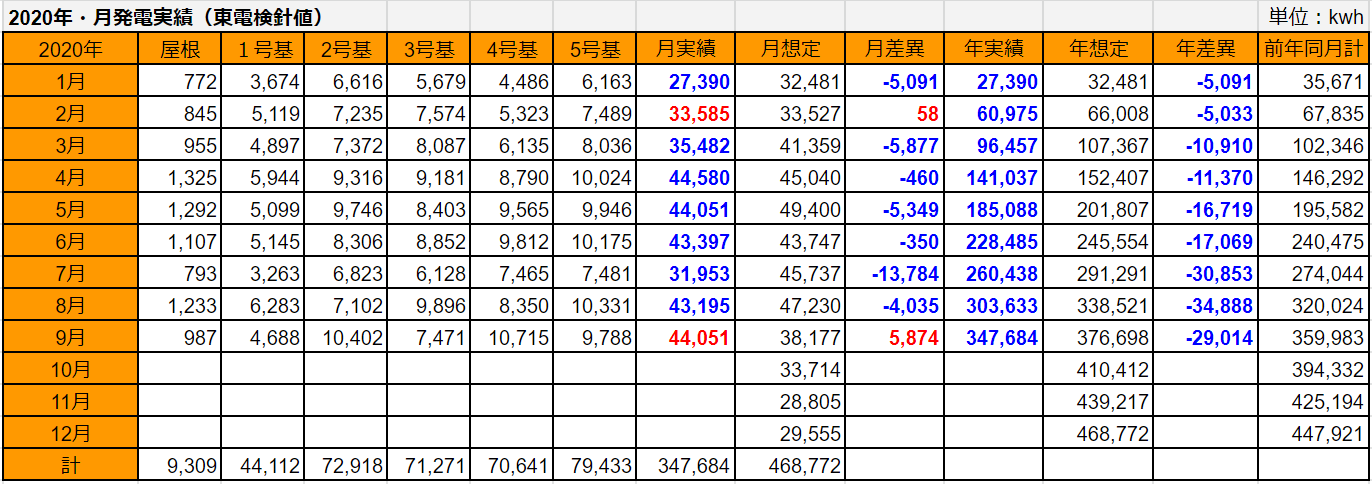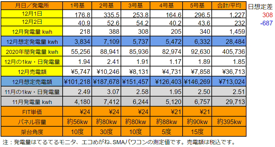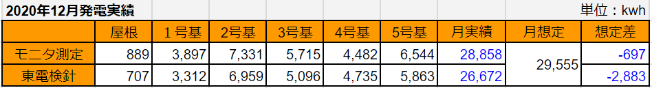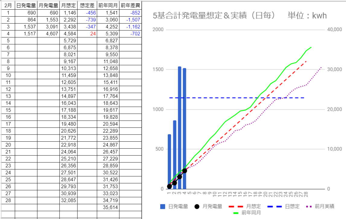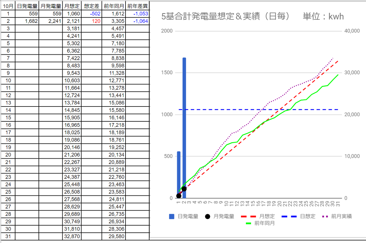 5基合計の発電量は1,647kWhで想定差は+109kWhでした。