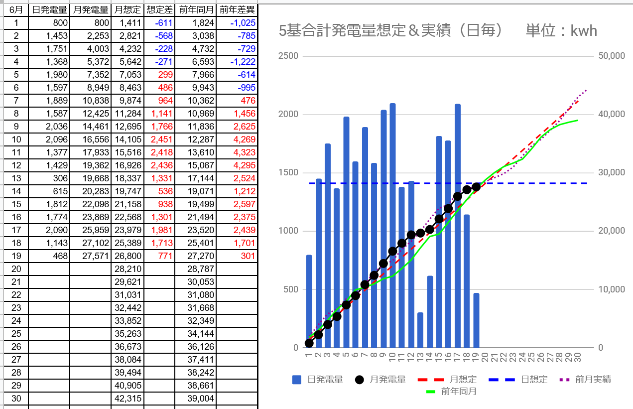 6/18の5基合計の発電量は1,143kWh(日想定差-268kWh)、6/19は468kWh(日想定差-942kWh)でした。