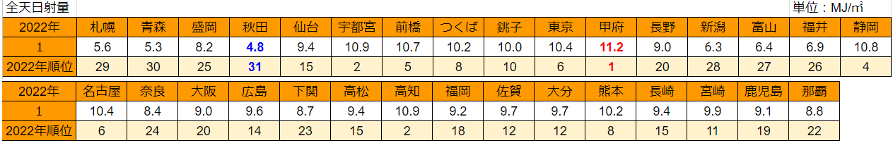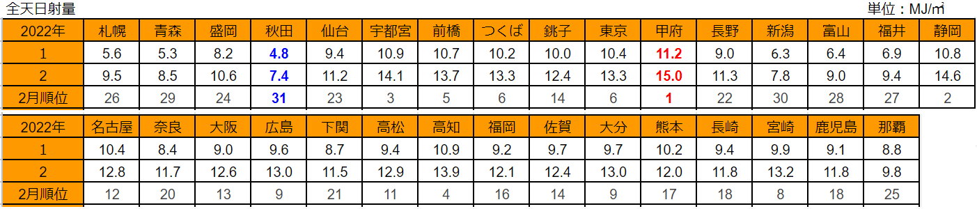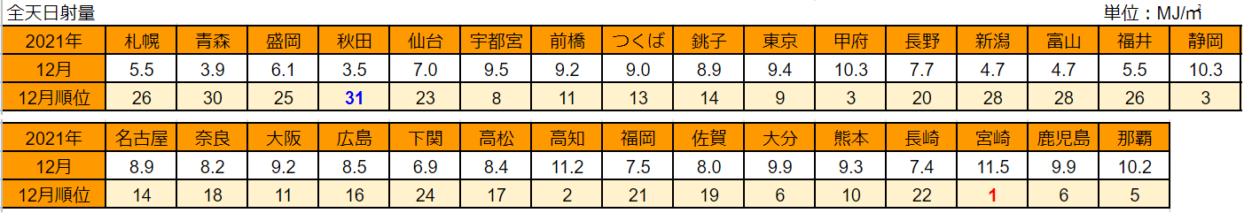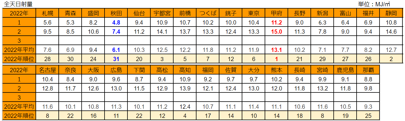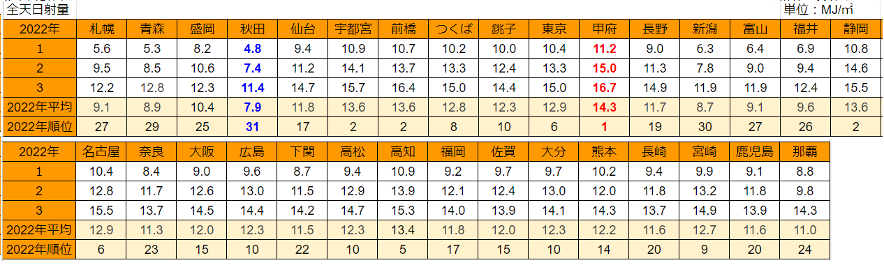 注:気象庁のHPで日射量を確認しています。ただし、県庁所在地の気象観測所でも日射量が掲載されていないところもありますので、地域性を考慮して日射量が掲載されている31箇所のデータをまとめています。