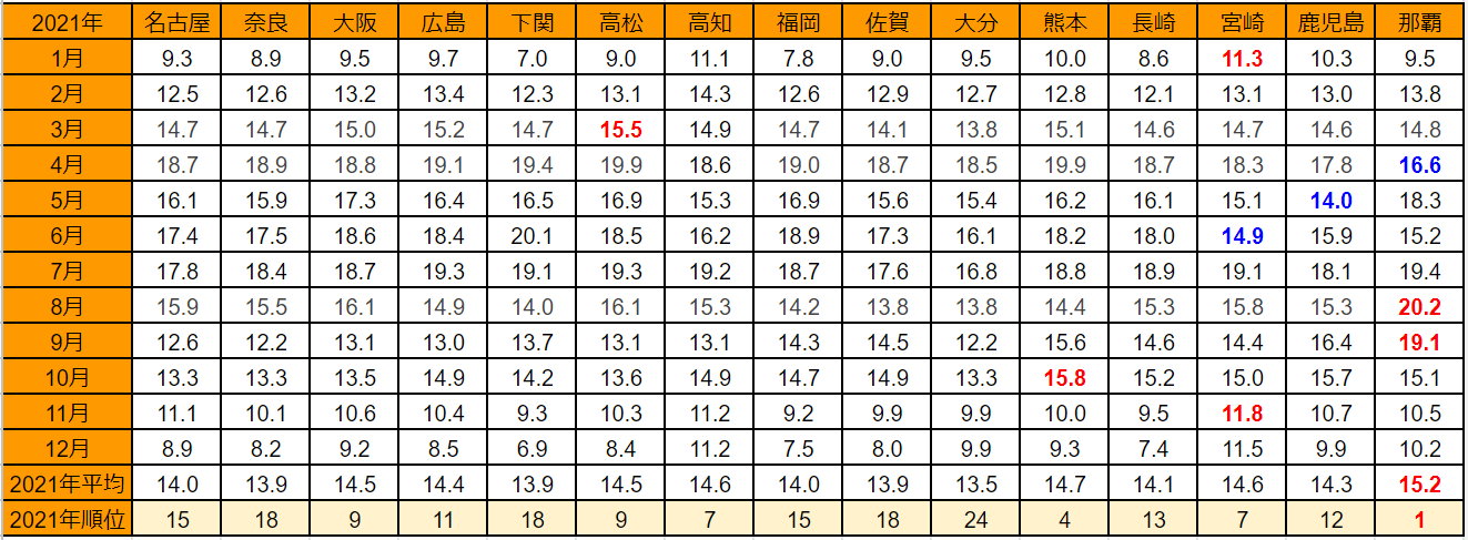 那覇に続くワースト2位は宮崎、3位は鹿児島と九州南部が続いています。