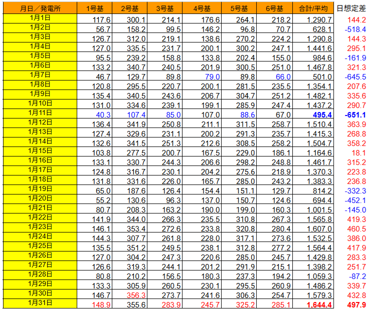 発電量を日別に見ると、1/31の発電量1,644.4kWh(想定比+497.9kWh)が最大で、最小は1/11の 495.4kWh(想定比 -651.1kWh)でした。日毎に日照時間が長くなっていることが影響したようです。