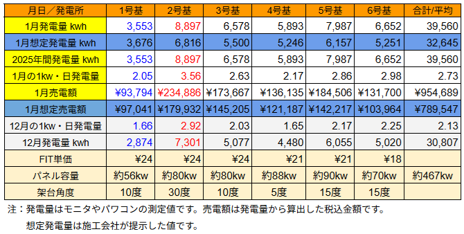 発電所別の発電量は2号基の8,897kWhが最大でした。2号基はパネル角度が30度あり、太陽高度が低くても効率的に発電を行えるためです。