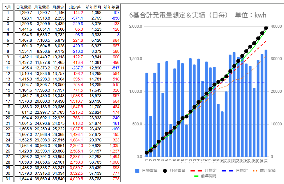やはり発電量は想定比+4,020.5kWhで、好調だった昨年1月の発電量(緑折線)も上回りました。(^^♪