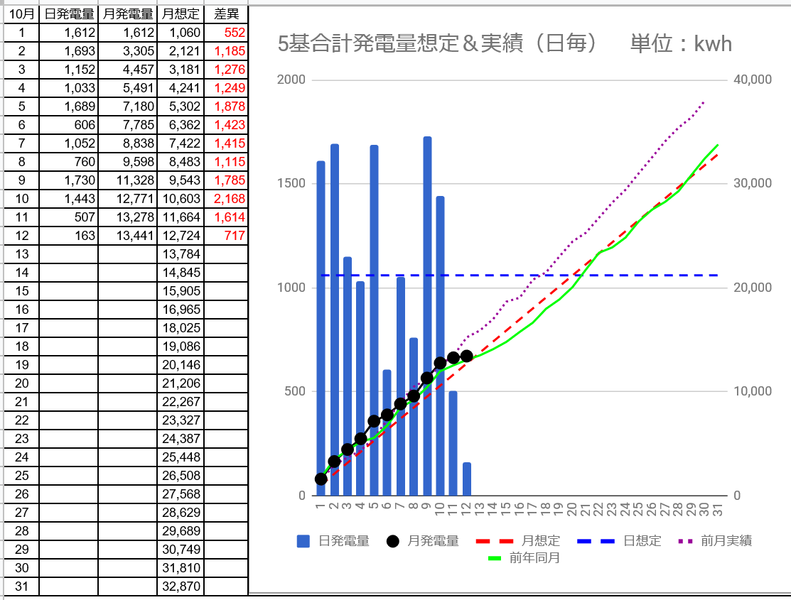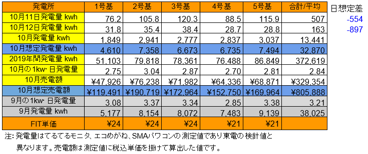 10/11の5基合計の発電量は570kwh(日想定差-554kwh)、10/12は僅か163kwh(日想定差-897kwh)でした。1kw・日当たりの発電量は3.24から2.84kwhにダウンしました。