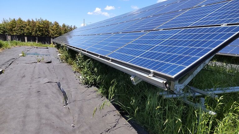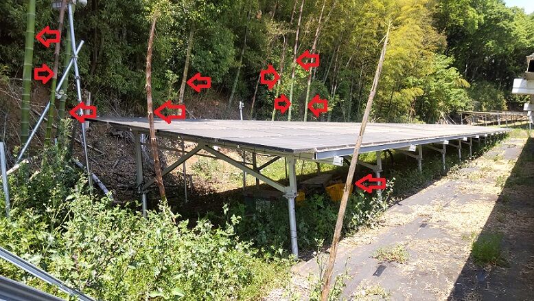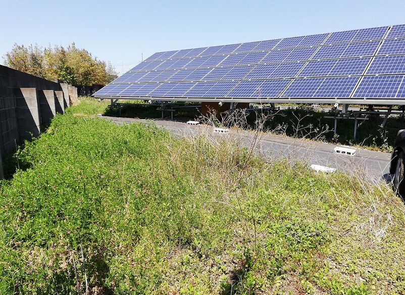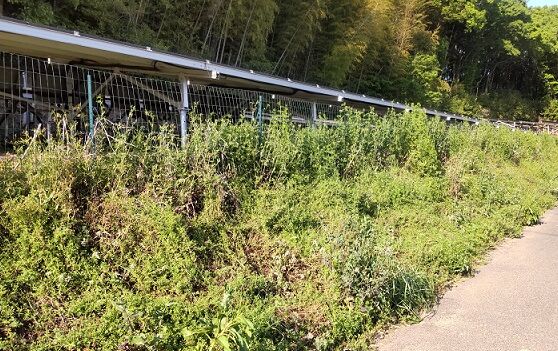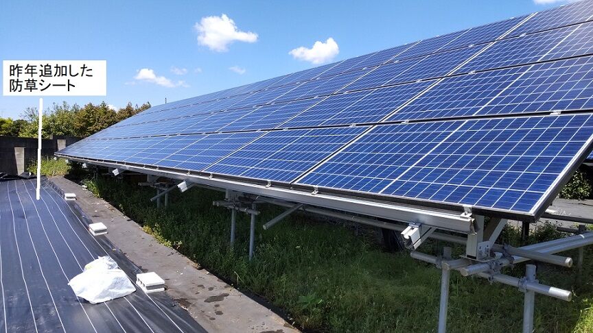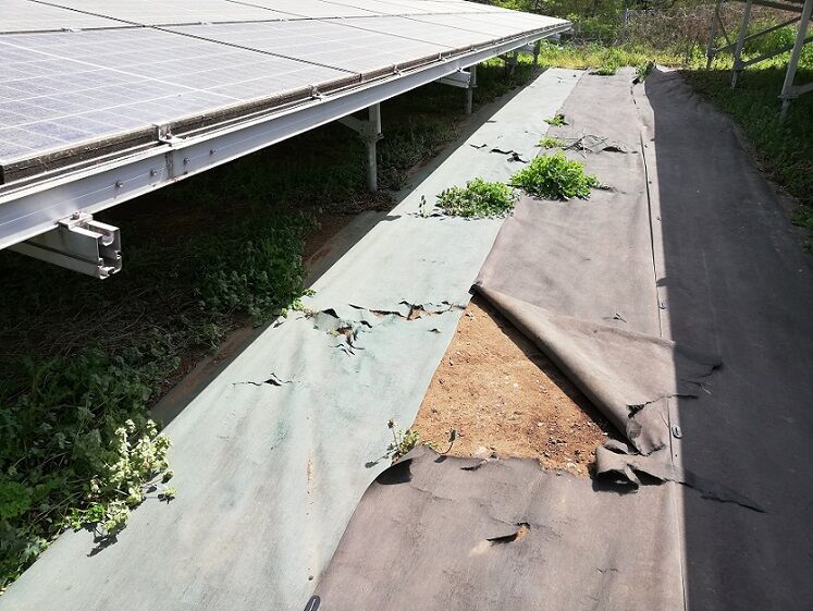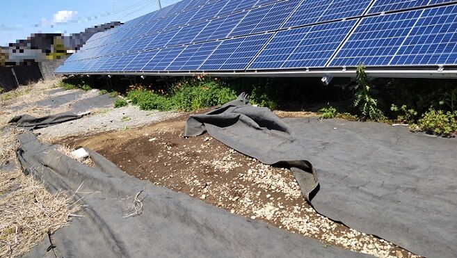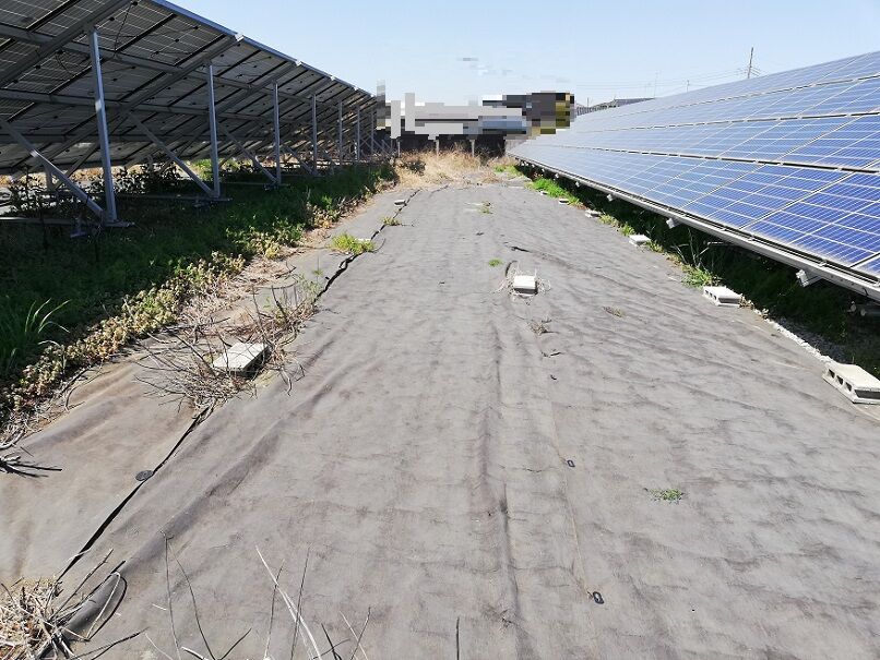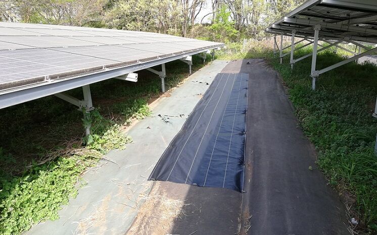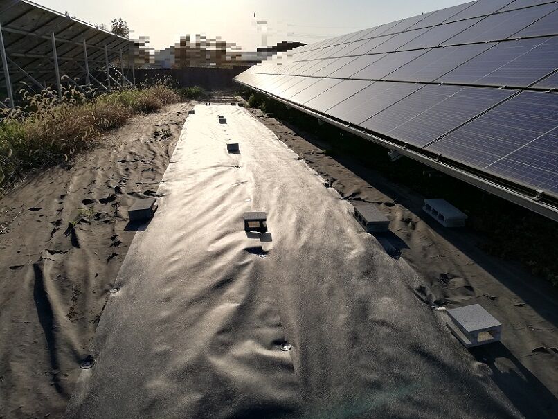 アレイ1列目の前です。防草シートを敷いているので問題ありません。