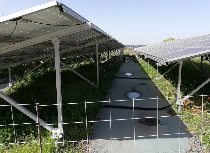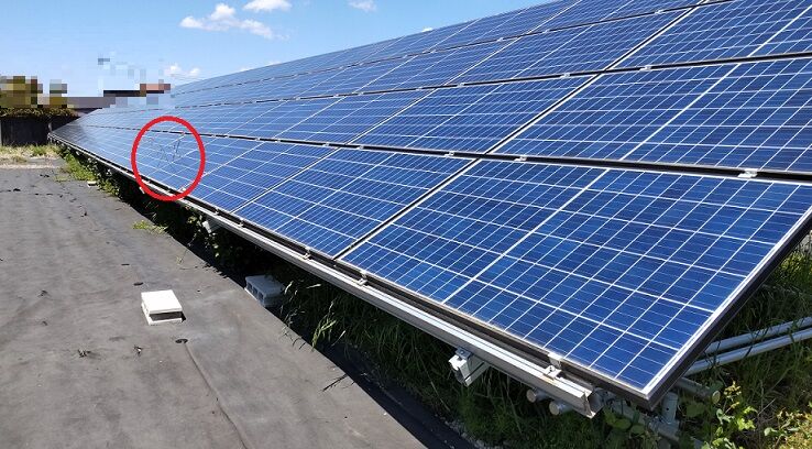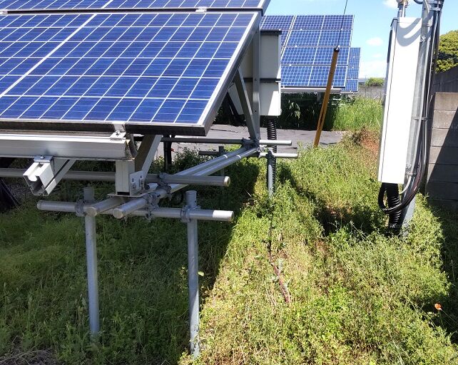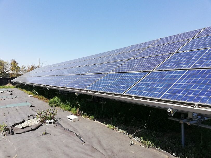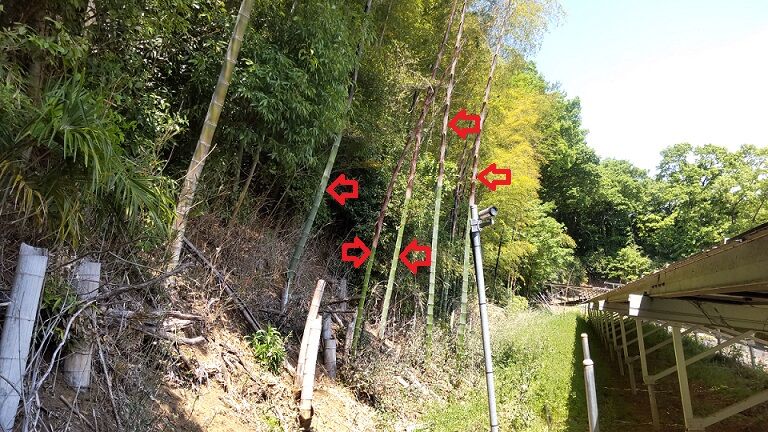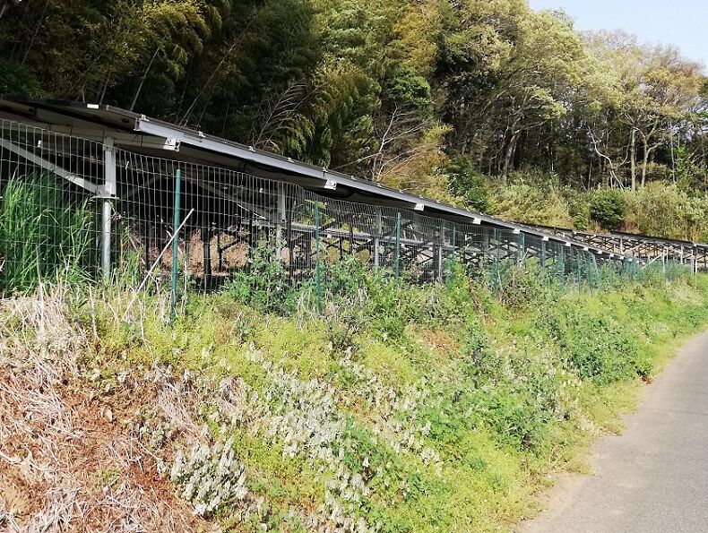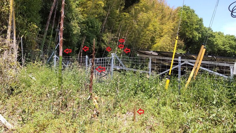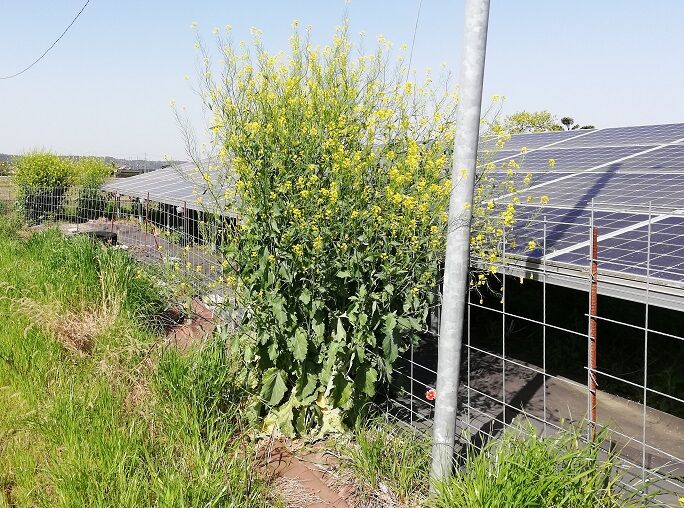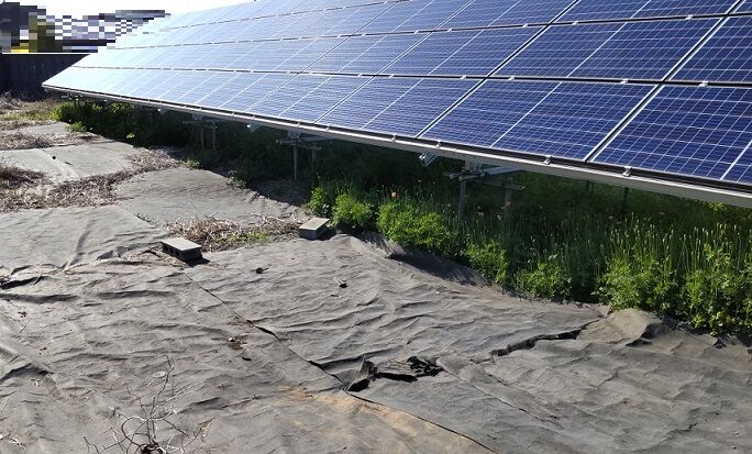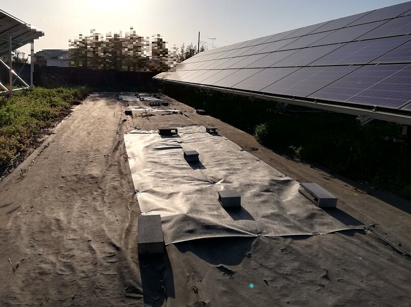 アレイ1列目の前です。防草シートを敷いているので問題ありません。