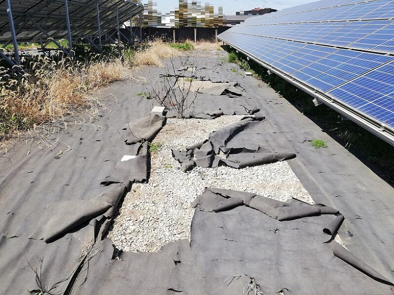 防草シートのつなぎ部分や空いた穴、防草シートが無い箇所から雑草が伸びていますので除草剤を散布しました。