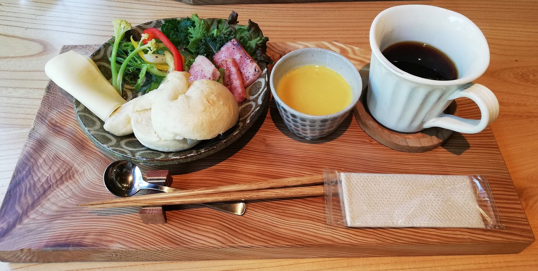 Cafeに入る時に注文した自家製ベーグルとベーコン(スープ、ドリンク付)が運ばれて来ました。