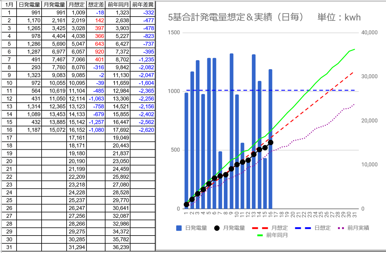 1/15の5基合計の発電量は432kWh(日想定差-578kWh)、1/16は1,187kWh(日想定差+178kWh)でした。パネル1kwあたり1日の発電量は2.43から2.39kWhにダウンしました。
