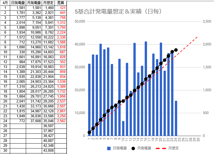 月間発電量は37,608kwhで想定発電量との差異は+2,861kwhから一旦+3,250kwhに伸びましたが、昨日は+2,562kwhに減少しました。今日、明日は雨模様で、4/29~30も曇天の天気予報です。何とか想定比プラスは維持して欲しいと思います。
