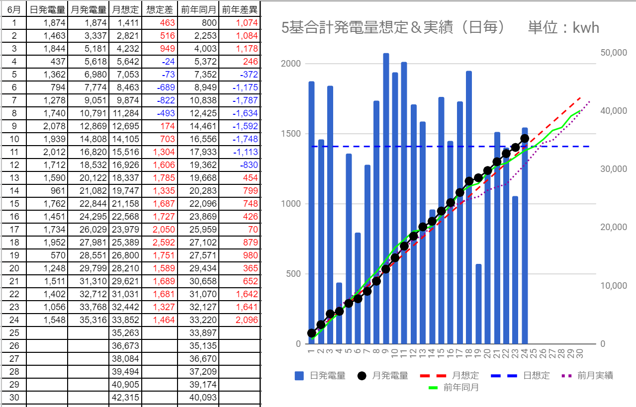6/23の5基合計の発電量は1,056kWhで想定差は-354kWh、6/24は1,548kWhで想定差は+137kWhでした。